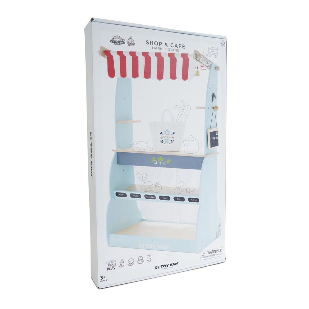 Little ones will adore serving customers at the café, then simply turn it around to reveal a market style shop complete with shelves, ideal for housing our wooden food crates. Complete with a reversible chalkboard, fabric shopping bag & bell for customers to ring for attention