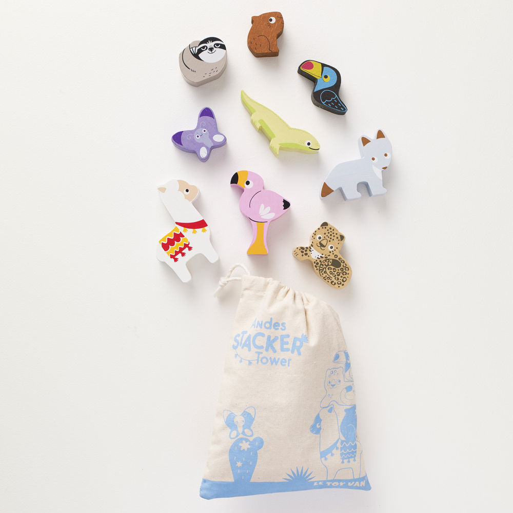 Painted in colourful hues using non-toxic, chip resistant paints, this cute set comprises eight chunky wooden animal shaped blocks and a little 'snow' peaked mountain, perfectly sized for small hands to grasp and includes a host of friendly pals including a llama, sloth, flamingo, lizard, toucan, butterfly and more