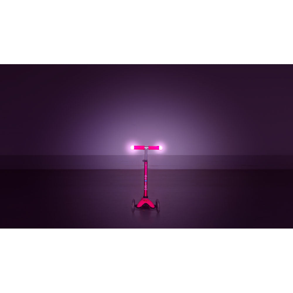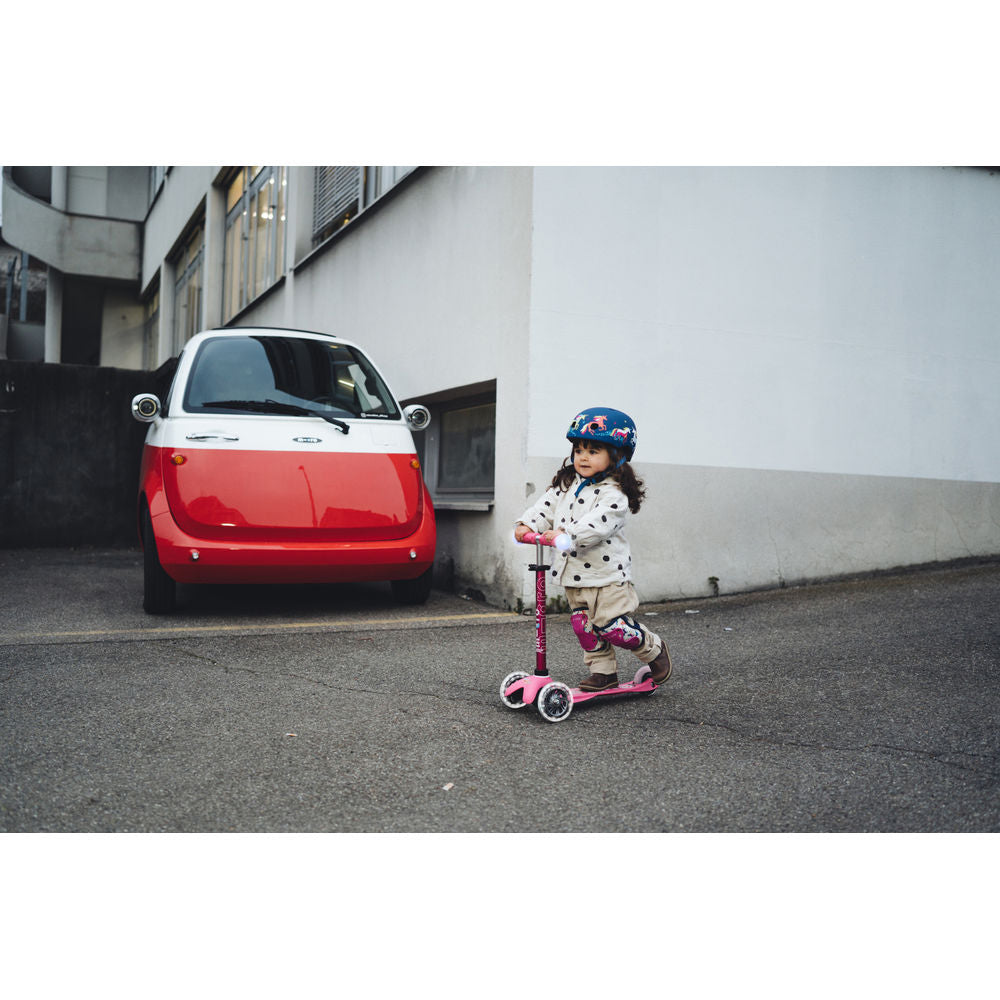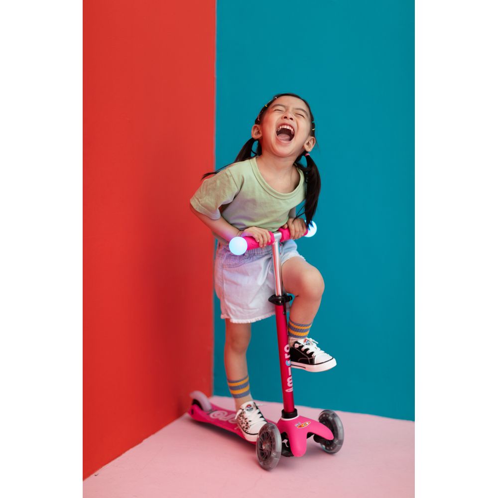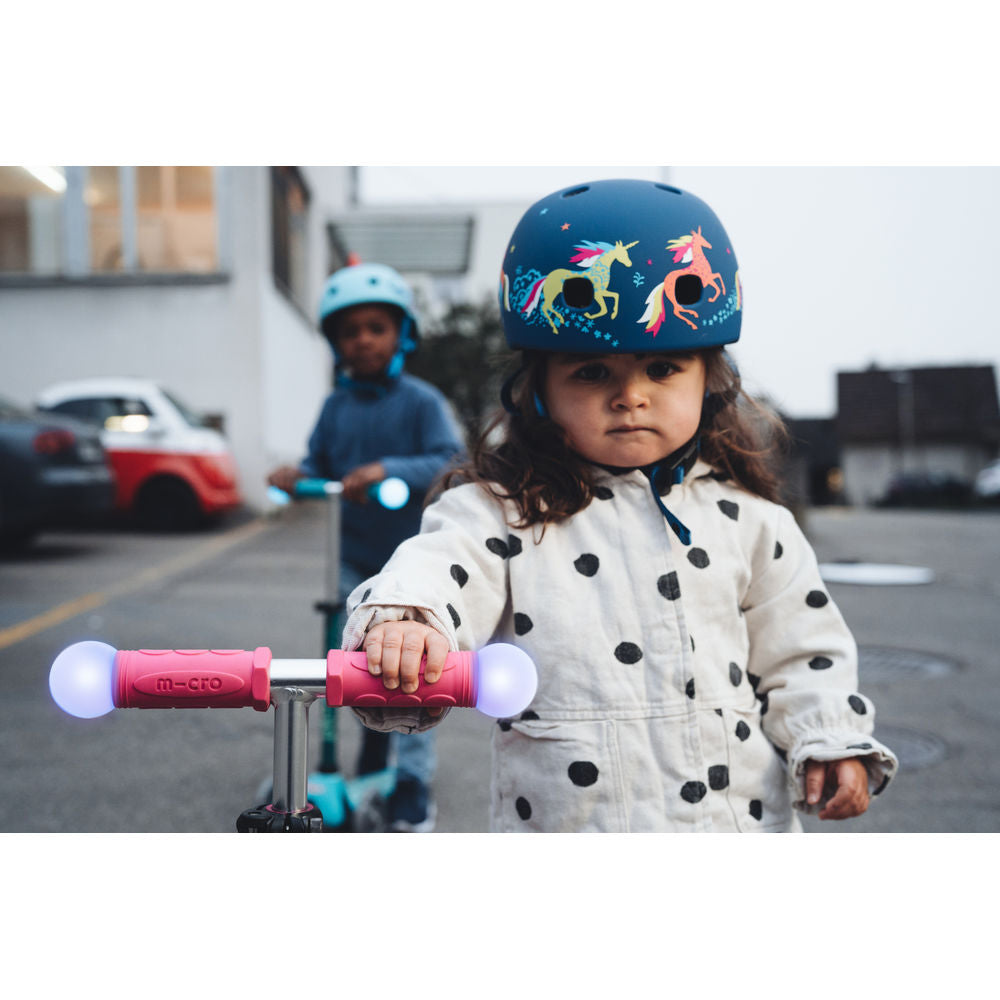As soon as your child touches the handlebar of the Mini Micro Deluxe Magic, the integrated touch sensor makes the LED lights on the handlebar shine in five different colours. This not only increases the fun factor, but also the visibility and safety in the dark