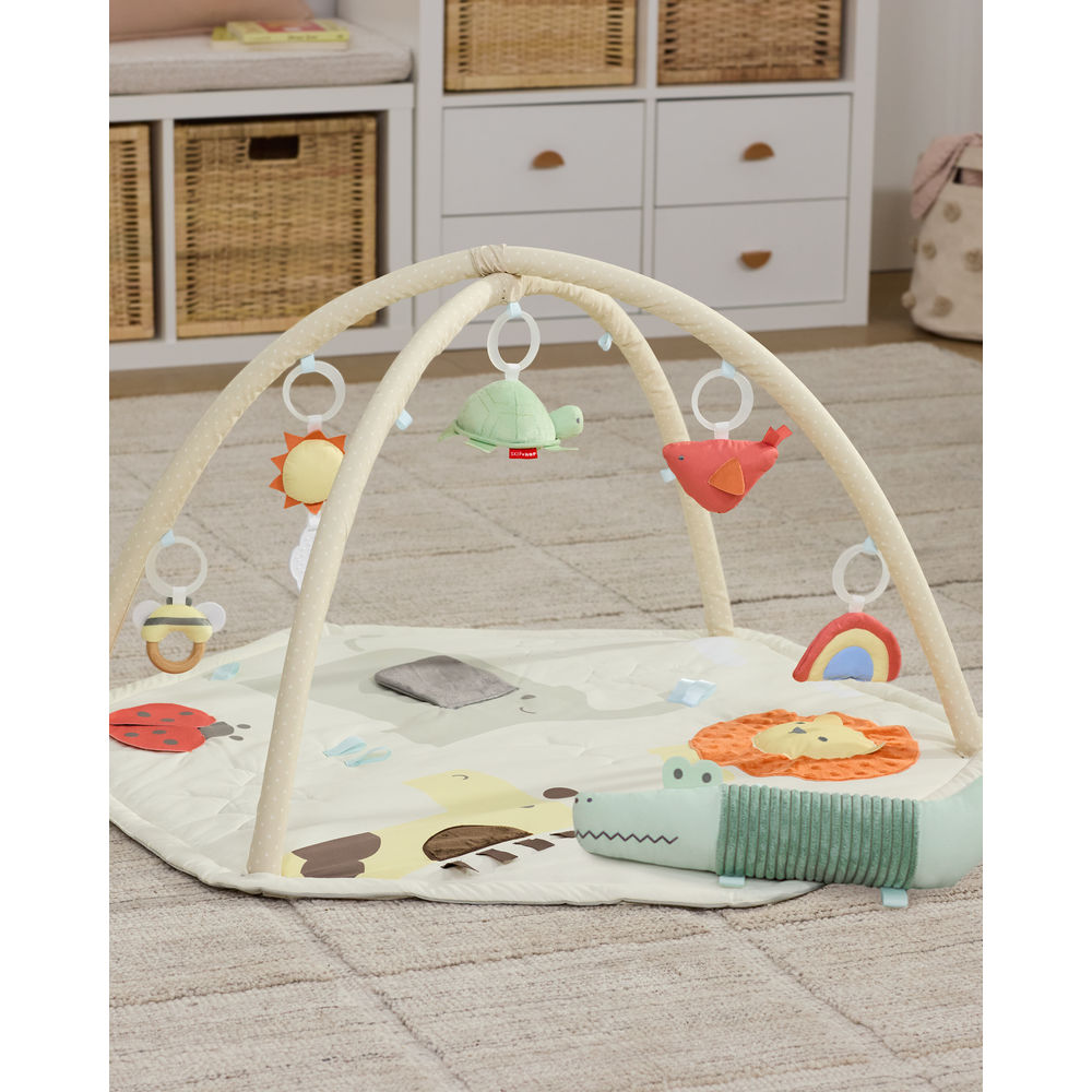 The Skip Hop Geometric Wonders Activity Gym is a stylish and engaging play space designed to support your baby’s sensory development from day one. Featuring a modern geometric design, this activity gym comes with a soft, cushioned mat and a sturdy arch with five interactive hanging toys that stimulate your baby’s vision, touch, and hearing