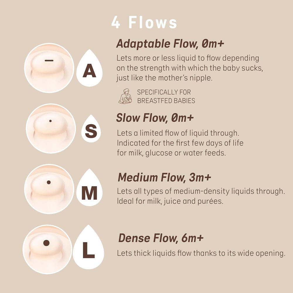 The flow is proportional to the suction: allows more or less liquid to flow depending on the strength with which the baby sucks.